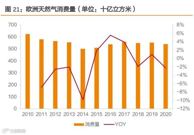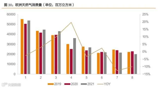 2022 年极端天气干扰因素有望减弱。2021 年上半年欧洲天然气消费量高增一大主因为极 端天气,包括低温酷暑带来的天然气需求增量以及少风带来的其他能源供给减量。根据 IEA 预测,若 2022 年极端天气干扰减少,欧洲的天然气需求将同比下滑约 2%。