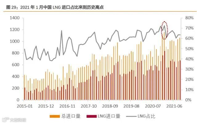 中国:冬季低温刺激 LNG 进口需求增加。2021 年初,东北亚地区出现低温寒潮事件,其 中北京的气温达到了过去 54 年来的最低值。严寒天气增加了供暖需求叠加经济复苏带来 的工业和电力需求,使得中国今年 1 月天然气需求同比增速超过 20%,达到 2018 年以来的 最高值。虽然国内的天然气产量在年初的两个月同比增加了 11%,但仍不足以满足需求的 增量。LNG 进口作为我国天然气供给中最具有弹性的一环,在今年 1 月国内天然气进口总 量中的占比达到了 72.4%的新高。
