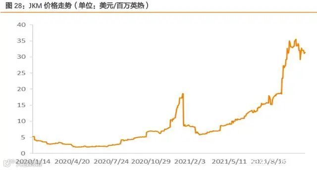 现货交易流动性的增长使得 JKM 更多地 被用于实物交割以及衍生品的定价参考,甚至在 LNG 长约合同中,传统采购定价模式已 经出现和国际原油价格指数强关联松动的趋势,JKM 也开始逐渐被用于 LNG 长约采购定 价公式中。JKM 价格自 9 月后快速攀升并于 10 月 21 日来到 35.555 美元/百万英热的历史高点,1 月 4 日至 11 月 12 日已累计上涨 119.7%。