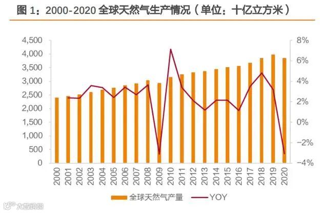 天然气指以气态碳氢化合物为主的各种气体的混合物,主要成分为甲烷(约占 85%-95%)。天然气的碳排放系数仅为 1.6tCO2/tce,远低于石油的 2.1 和煤炭的 2.6tCO2/tce,是更加 优质和清洁的燃料和化工原料。在全球加速能源转型和碳减排的背景下,天然气作为过渡 能源的重要性日益凸显。近年来,全球天然气的产量和消费量均呈稳步增长态势,2019 年分达到 3.98 和 3.9 万亿立方米的历史最高值,2000-2019 年产量和消费的复合增速分 别达到 2.7%和 2.6%。2020 年,受新冠疫情与低油价双重冲击,世界天然气产量为 3.85 万 亿立方米,同比下降 3.1%。同时,全球范围内的产品生产与贸易也受到疫情的严重影响, 一次能源消费总量下降 4.5%,天然气消费量 3.82 万亿立方米,同比下降 2.1%。