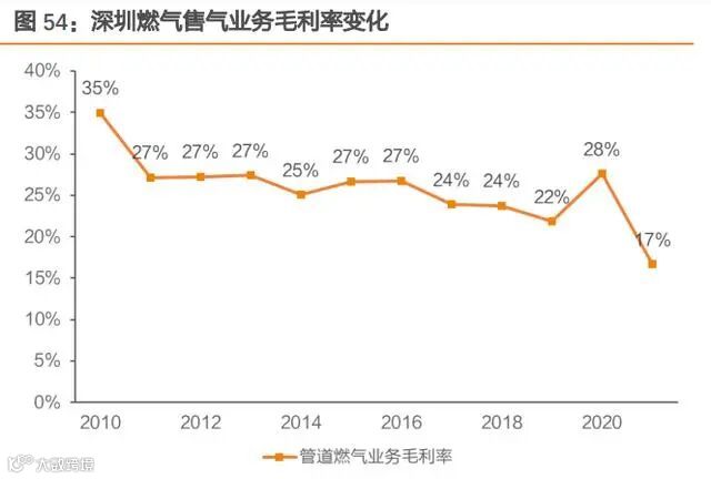 气源价格上涨叠加顺价的阻力导致城燃公司的毛差承受较大的缩窄压力。以新奥能源及深 圳燃气为例,新奥能源上半年毛差同比下滑了 0.05 元,深圳燃气售气业务毛利率同比下滑 近 10 个百分点。因此,中短期气源采购成本的抬升对于下游城燃而言压力较大。