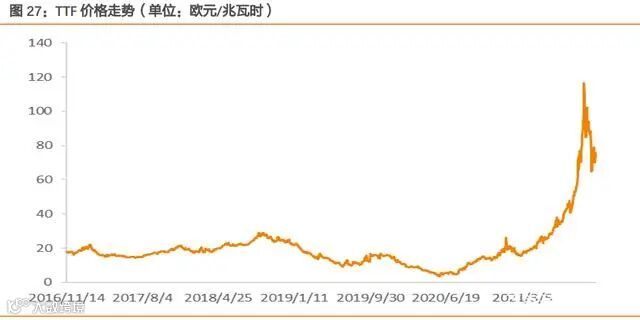 TTF 目前是欧洲大陆唯一 的基准枢纽,其他欧洲大陆枢纽的价格基本按照 TTF 价格升贴水定价。洲际交易所和欧洲 能源交易所等能源交易所都推出了以 TTF 为交割地的天然气现货、期货、期权品种。自 2021 年以来 TTF 价格快速上行,1 月 4 日至 11 月 19 日已经上涨约 340.9%,并于 10 月 5 日达到 116.5 欧/兆瓦时的历史高点。(报告来源:未来智库)