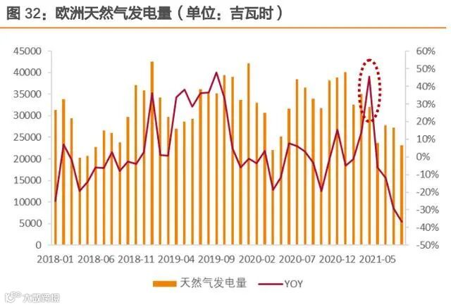 风力不足带来的能源供给减量。近年来欧洲风电装机规模持续增长,2020 年新增装机规模 达到 14.7GW,其中德国的风电发电占比已经由 2016 年的 15.8%提升至 2019 年的 23.3%。今年欧洲北部和中部风速大幅放缓,6-7 月欧洲地区的风电发电量合计降低 11.6%,占总发 电量比重从去年同期的 11.5%下降至 9.8%,其中德国上半年风电发电量同比减少 20.4%。可 再生能源发电量的降低导致天然气发电的需求大幅增长,2021 年第二季度欧盟天然气发电 量 83563.3 吉瓦时,相较于 2020 年同期增加 6%,相较于 2019 年同期降低 1.6%。