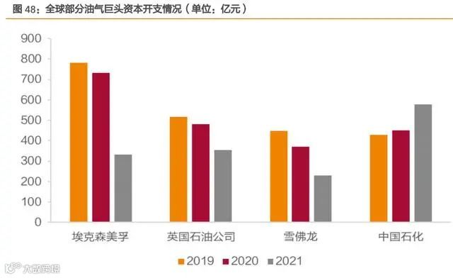 全球范围内能源加速转型进一步压制油气公司的的资本投入意愿。今年上半年油气价格持 续上涨,其中英国石油公司平均石油售价为 56.91 美元/桶,较去年同期的 34.39 美元/桶上 涨 65%,这带动油气公司业绩出现明显回升。英国石油公司 2021 年上半年实现归母净利润 77.83 亿美元,上年同期为亏损 212.13 亿美元,同比增长 136.7%;埃克森美孚公司 2021 年上半年实现归母净利润 74.2 亿元,同比增长 539.05%。虽然财务状况明显好转,但是除 中国石化外,国外主要油气公司的资本开支仍然呈现同比下降趋势,其中埃克森美孚 2021 年上半年资本支出为 332.5 亿元,较 2020 年同期减少 54.7%。