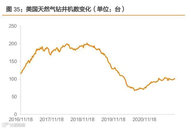 2021 年 1-9 月,美国天然气产量同比增加 0.4%。虽然 Q1 同比下滑 6%,但是 Q2 增长迅速, 主要产地阿巴拉契亚盆地 9 月的月产量已经超过 280 亿立方米,达到了自 2020 年 12 月以 来的最高水平。此外,天然气活跃钻井数自去年 7 月降至最低点后一直处于稳步回升状态, 截至 2021 年 11 月 12 日,钻井机数已经重回 100 大关,但是相较于 2018 年年均 190 台 还存在较大的差距。