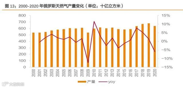 产量方面,俄罗斯是仅次于美国的全球第二大天然气生产国,2015-2019 年天然气产量复 合增速为 1.2%,并于 2019 年达到 6790 亿立方米的历史高点。2020 年产量为 6385 亿立方 米,同比下滑 5.97%。