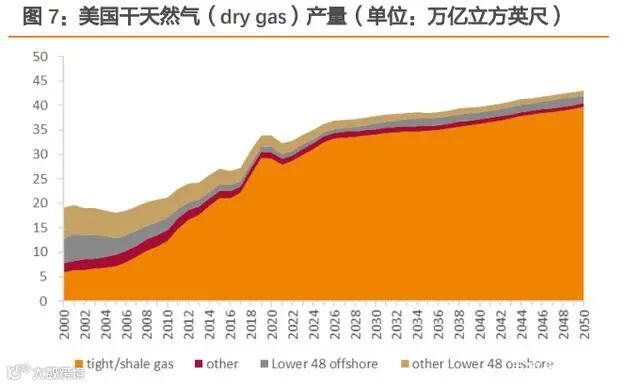 产量方面,自上世纪九十年代末页岩气革命以来,美国页岩气产量占总产量比例已经由 2000 年的 31%上涨至 2020 年的 86%。得益于页岩气产量的快速增长,从 2011 年开始至今, 美国已经超越俄罗斯成为全球最大的天然气生产国。2000-2019 美国天然气产量 CAGR 为 3.1%,高于全球 2.7%的平均增速,2019 年产量达到创纪录的 9300 亿立方米。2020 年在 疫情影响下,钻井和开采活动频率下降,产量 9146 亿立方米,相较于 2019 年下滑 2% 左右。