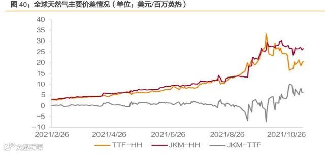 亚洲市场对 LNG 的依赖程度高于欧洲市场,主要原因如下:一方面是库存能力,欧洲有超 过 1000 亿立方米的库存,同时管道气也能增加其供应的灵活性。与欧洲相比,亚洲受制 于有限的 LNG 库存能力,在冬季的时候 LNG 需求会更加旺盛,使得 JKM 价格曲线相较于 TTF 更具备季节性;另一方面,煤气转化的灵活性使得欧洲电力部门对于天然气需求相较 于亚洲更具备弹性。因此当市场供应紧张时,亚洲市场对于 LNG 相较于欧洲市场更高的依赖度会导致 JKM 对 TTF 的溢价,将欧洲的船货转运至亚洲将会变得有利可图。
