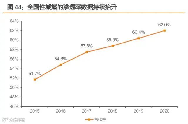 工业燃料、发电用气或为超预期的点。根据国际能源局等每年编制的《中国天然气发展报 告》口径,天然气下游需求大致可分为以下四个板块:城市燃气、工业用气、发电用气和 化工用气,2019 年这四大需求占比分别约为 37%、35%、17%、11%。城市燃气主要包括居民及商业用气,在每年 1 个百分点左右的渗透率的提升以及城乡煤改 气的持续推进下,将维持稳定增长。化工用气一方面占比较小、贡献增量有限,另一方面 受相关化工行业周期性影响,成长性并不显著。