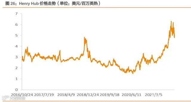 亨利枢纽同时也是纽约商业交易所天然气期货合约指定交割地,其价格是北美天然气交易 的基准价,在全球天然气贸易中有着重要影响力。2021 年以来全球天然气价格快速上行, Henry Hub 价格于 10 月 5 日来到 6.3 美元/百万英热的历史高点,1 月 4 日至 11 月 19 日 已经累计上涨 135%。