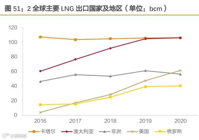 目前全球液化产能看排名前五的国家分别是澳大利亚、卡塔尔、美国、马来西亚和俄罗斯, 其中澳大利亚、卡塔尔和美国拥有全球超过一半的液化产能,2020 年三个国家的 LNG 出 口量分别达到 1062/1061/614 亿立方米。