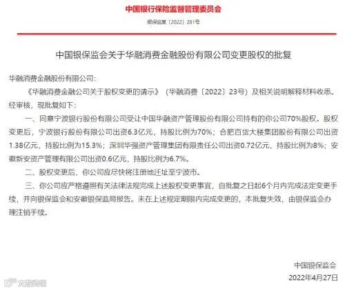 银保监会官方网站披露了其对华融消费金融变更股权的批复,同意宁波银行受让中国华融持有的华融消费金融70%股权,批复日期为4月27日。此时距离去年底宁波银行以10.91亿元竞得该部分股权,仅过去了4个月的时间。