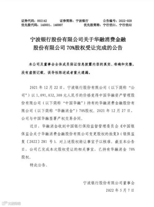 2021年12月28日,宁波银行发布董事会临时会议决议公告,审议通过了《关于宁波银行股份有限公司对外股权投资的议案》,同意宁波银行10.91亿元受让华融消费金融。在此次监管审批落地后,宁波银行将正式入主华融消费金融。