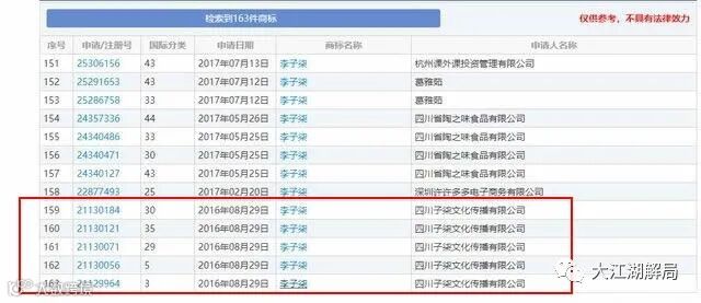 2016年8月29日,还没有火的李佳佳,颇有远见地注册了5个关于李子柒的商标。