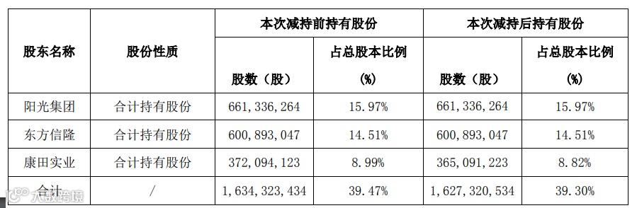 近期,阳光集团正通过处置资产、请求金融机构及政府支持等措施积极自救,但受宏观经济环境、金融行业监管环境、新冠疫情及行业政策调控等多项因素的不利影响,阳光集团仍面临阶段性的流动性问题,并面临诉讼、仲裁、资产被冻结等影响正常经营的不确定事项。截至报告日,控股股东及其一致行动人累计被冻结424,419,864股,占所持公司股份比例25.02%,占公司总股本比例10.25%。截至报告日,控股股东及其一致行动人因部分账户维持担保比例低于平仓线,通过集中竞价的方式被动减持公司股份累计145,934,900股,占公司总股本的3.52%(详见公司2021-202、2022-012、2022-021公告)。被动减持后控股股东及其一致行动人合计持有公司股份1,675,211,834股,占公司总股本的40.46%。目前上述风险事项暂不会导致公司控制权发生变更,暂不存在控制权不稳定的风险。公司与控股股东在资产、业务、财务等方面均保持独立,上述事项不构成对公司生产经营、公司治理实质影响。公司将持续积极关注上述事项的进展情况,并督促控股股东严格按照有关法律法规及规范性文件的要求,及时履行信息披露义务。