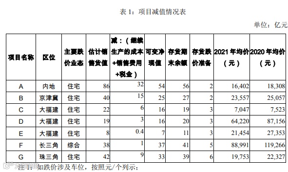 5、大福建E项目:2021年受疫情及项目所在城市市场预期影响,叠加市场对公司流动性风险预期,成交量持续下滑严重,项目促销降价走量(由2.74万下降至2.15万),未售部分按照实际售价进行计提,根据成本与可变现净值孰低法测算,预计跌价金额约4.8亿;