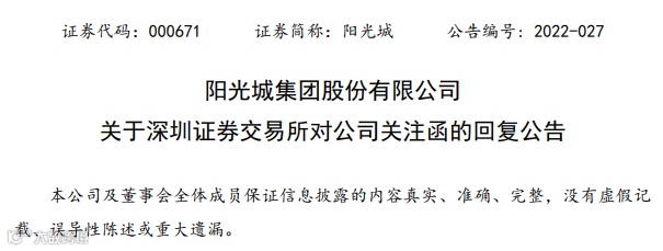日收到深圳证券交易所发出的《关于对阳光城集团股份有限公司的关注函》(公司部关注函【2022】第 88 号)(以下简称“关注函”)。根据关注函中的要求,公司及时组织相关部门及公司的审计机构,就关注函所提出的问题进行了认真的讨论和分析,现将回复内容公告如下: