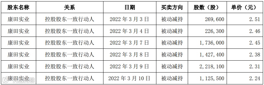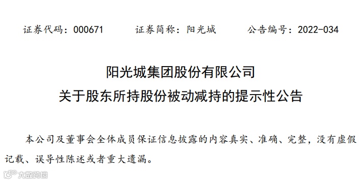近日,阳光城集团股份有限公司接到公司控股股东一致行动人福建康田实业集团有限公司的通知,获悉康田实业因其部分账户维持担保比例低于平仓线,于 2022年3月3日—3月10日期间通过集中竞价的方式被动减持公司股份7,002,900 股,占公司总股本的0.17%,本次被动减持的相关情况如下: