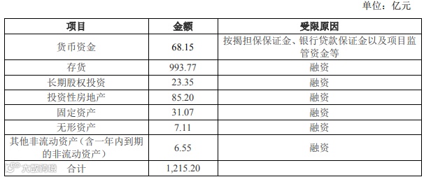 截至2021年6月末,公司受限资产主要系因借款而抵质押的存货、货币资金、长期股权投资、投资性房地产、固定资产、无形资产和其他非流动资产等,账面价值合计为1,215.20亿元,占公司资产总额的比例为33.92%,占比相对较高。