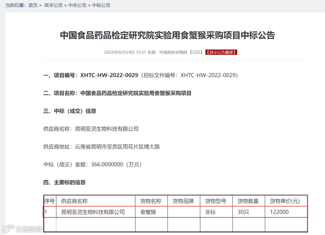 2022年2月24日,官方采购平台发布了中国食品药品检定研究院采购食蟹猴项目的中标公告,最终由昆明亚灵生物成功中标,供应数量为30只,货物单价为12.2万元。