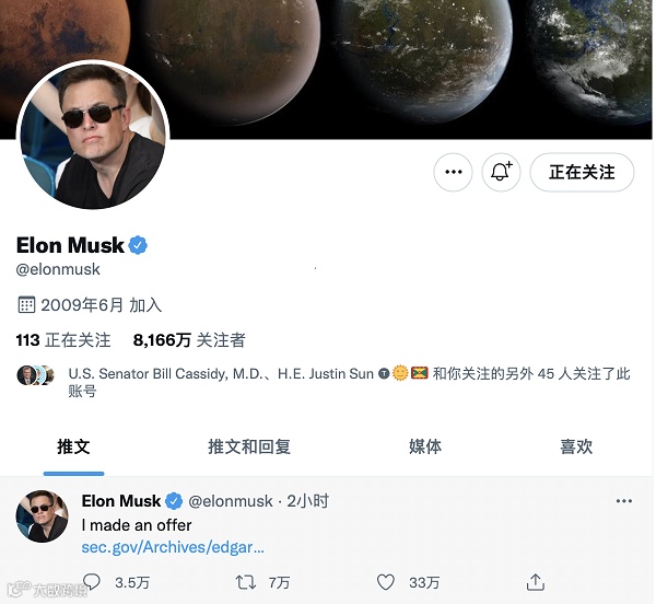 美国时间13日,埃隆马斯克向Twitter董事会主席发出一个强硬的要约收购,欲以比投资前溢价54%的价格私有化收购Twitter。马斯克这一要约超出了Twitter的预料。消息出来,Twitter股价已经涨了5%。Twitter董事会表示,将在高盛与Wilson Sonsini Goodrich & Rosati的建议下评估马斯克的报价。