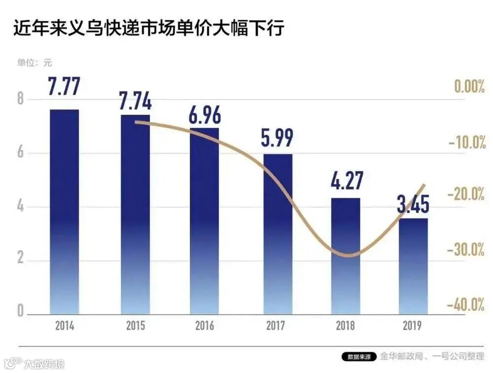 从2013年开始,义乌快递价格一直以每年0.6-0.8元的速度稳步下降。到了2019年中,在义乌这个全球最大的小商品集散地,快递单价低至一元,史无前例。