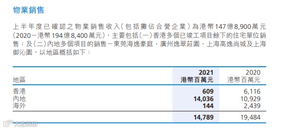 上半年长实集团物业销售总额147.89亿港元,同比下跌24.1%。其中来自内地的收入140.36亿港元,增长了约28%;来自香港地区的收入为6.09亿港元,下滑90%。
