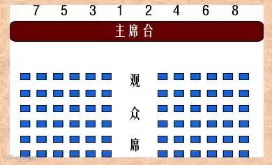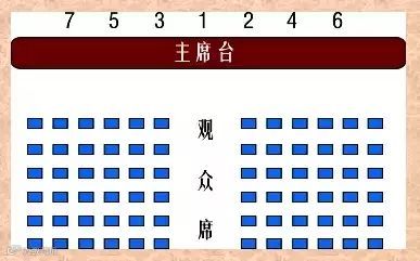 主席台座次排列,领导为单数时,主要领导居中,2号领导在1号领导左手位置,3号领导在1号领导右手位置;可参见下图的座次排列图: