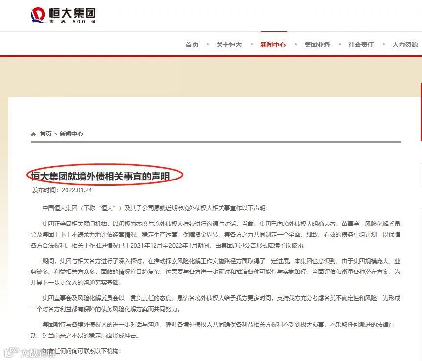 恒大正面临包括美元债在内的多方债务压力。此前,1月24日,恒大集团官网发布了一份言辞恳切的声明——《恒大集团就境外债相关事宜的声明》。