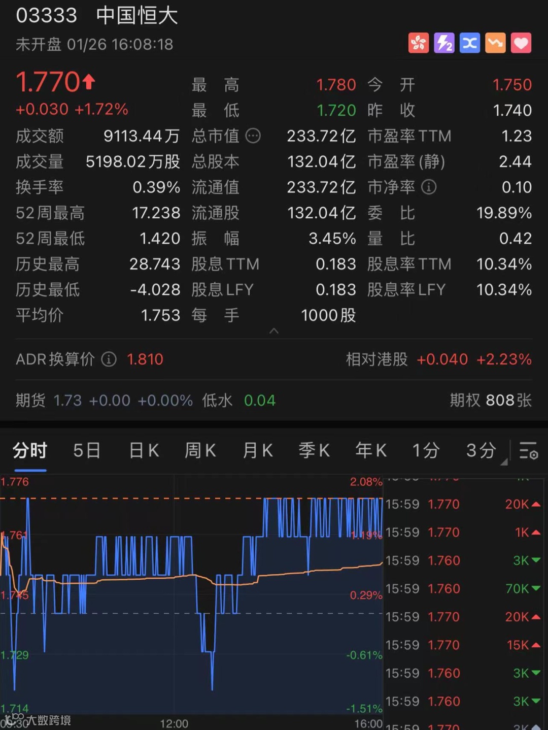 截至1月26日收盘,中国恒大报1.77港元,涨1.72%。