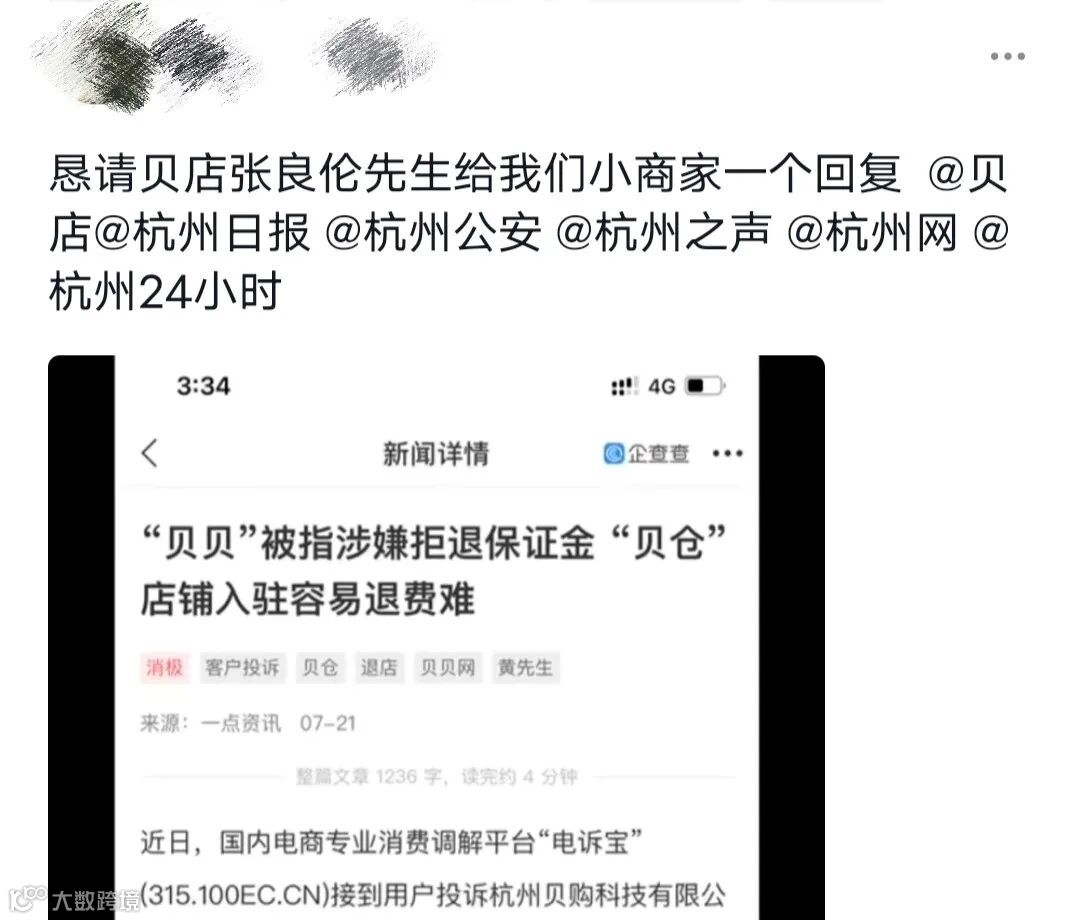 从2020年开始,在电诉宝、黑猫投诉等网络纠纷服务平台上已陆续用户投诉,反映贝贝集团旗下“贝店”、“贝仓”入驻店铺均有违背承诺,退店不退保证金的情况。