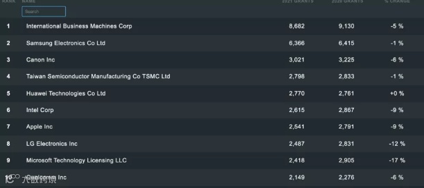 整个美国2021年度的专利排行榜,整个前十名里面,只有华为一家是正增长,其他的9家巨头,反而都出现了下滑。包括苹果、英特尔、高通这些科技巨头。