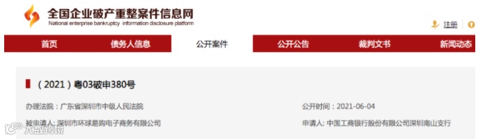 全国企业破产重整案件信息网显示,“A股跨境电商第一股”跨境通(002640.SZ)旗下全资子公司环球易购在6月4日被工商银行深圳南山支行申请破产,而环球易购承担了跨境通九成以上的营收。