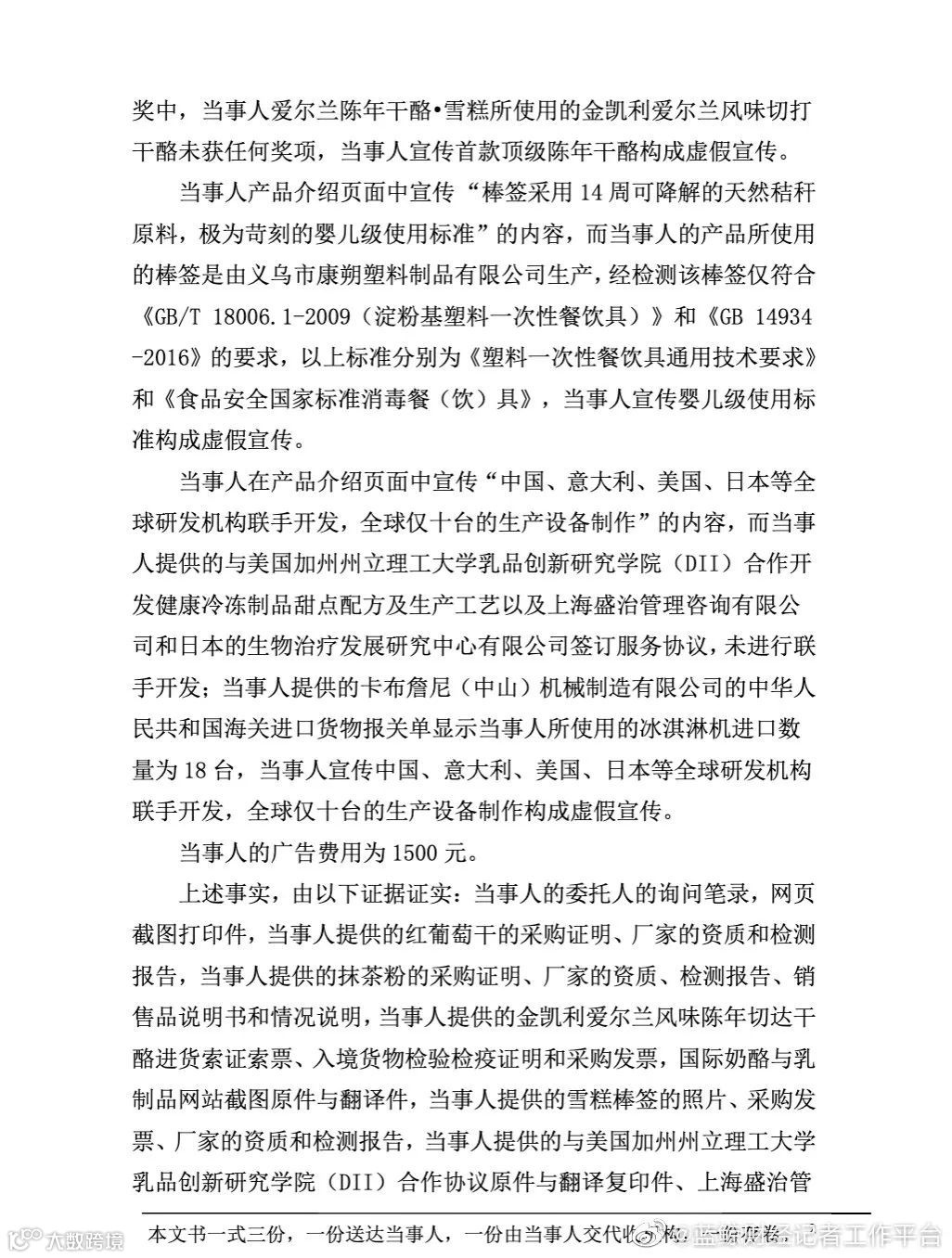 3、为显示其高端定位,钟薛高曾宣传其原材料曾获得国际奖项,与全球机构联合研发等等,但事实却并非如此。据行政处罚书,钟薛高在爱尔兰陈年干酪•雪糕页面宣传“钟薛高荣誉原创,中国首款顶级陈年干酪,鲜奶与陈酪的奇妙组合,独一无二,原产切达陈年干酪,陈放经年,色金黄,味甘浓香,零添加,营养健康”的内容。