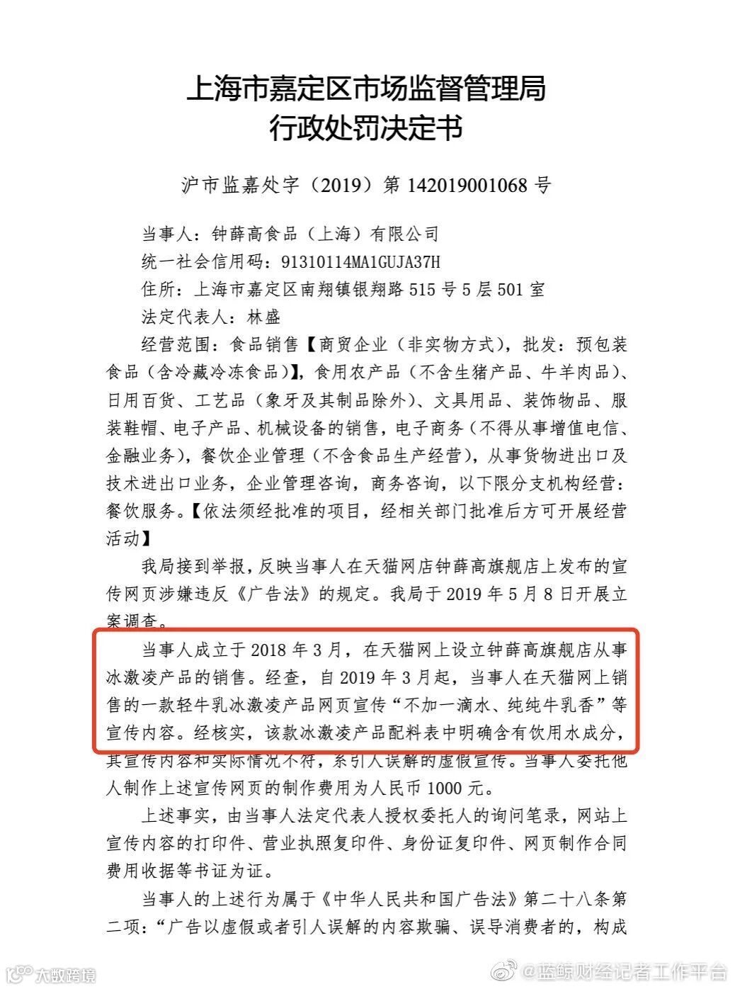 而在上海市嘉定区市场监管局下发的另一张处罚决定书中表示,钟薛高自2019年3月起,在天猫网上销售的一款轻牛乳冰激凌产品网页宣传“不加一滴水、纯纯牛乳香”等宣传内容。经官方核实,该款冰激凌产品配料表中明确含有饮用水成分, 其宣传内容和实际情况不符,系引人误解的虚假宣传。
