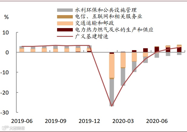广义基建主要包括以下领域:电力热力燃气及水的生产和供应(占比约16%)、交通运输和邮政(占比约35%)、电信和互联网等信息传输(占比约2%)、水利环保和公共设施管理(占比约47%,包括市政建设)。今年以来各领域的表现如下: