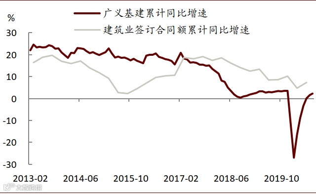 图表: 建筑业合同额与广义基建增速趋势多数时期一致