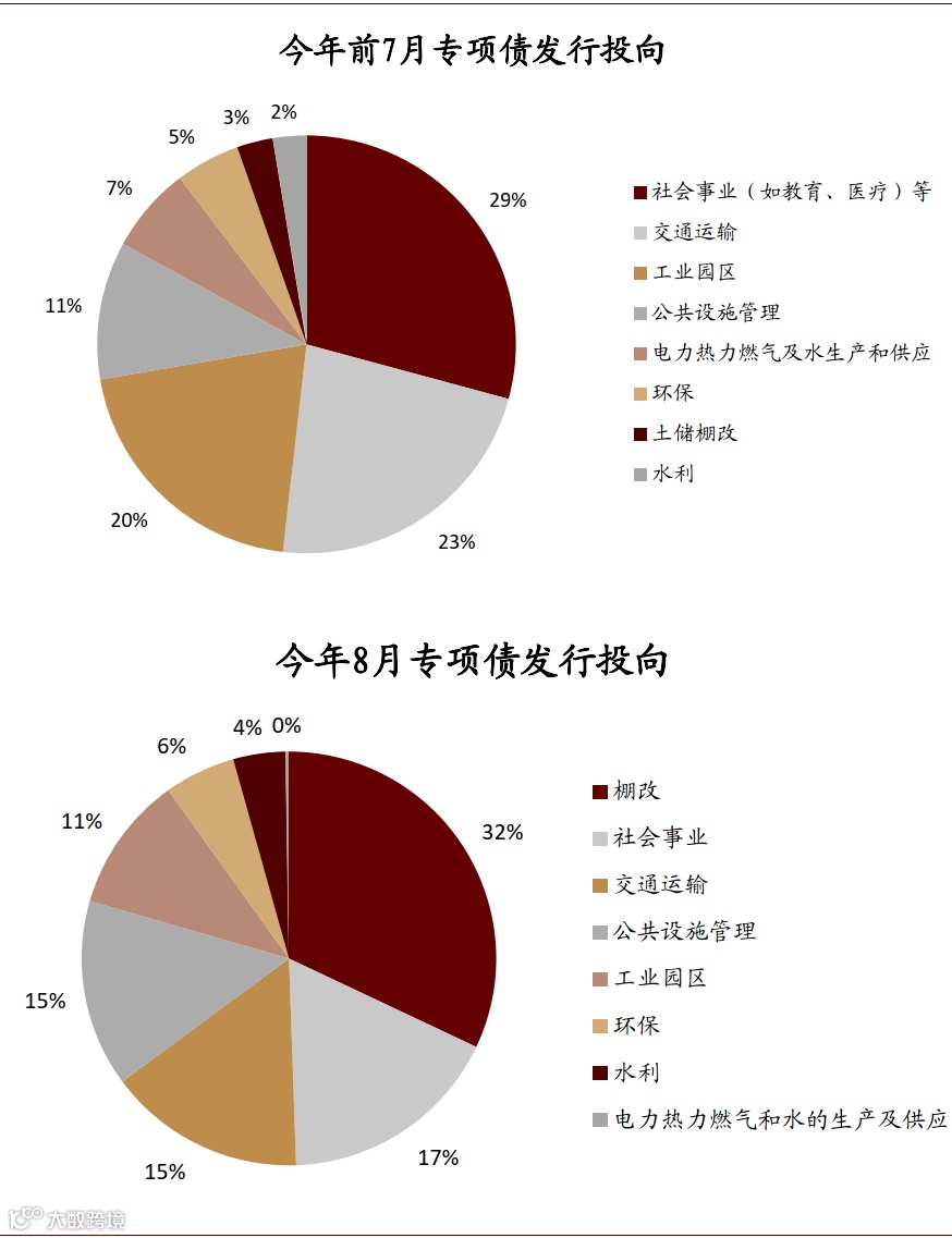 不过以上问题均有在改善。7月底财政部发布《关于加快地方政府专项债券发行使用有关工作的通知》,指出“赋予地方一定的自主权,对因准备不足短期内难以建设实施的项目,允许省级政府及时按程序调整用途,优先用于党中央、国务院明确的‘两新一重’、城镇老旧小区改造、公共卫生设施建设等领域符合条件的重大项目”。专项债在支出方面的灵活度提高,但今年8月至9月中旬专项债新增发行约9200亿元,其中棚改占比上升至32%,棚改等可能会分流部分专项债资金。
