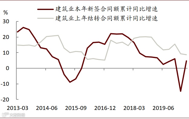 如果从季度频率看,统计局发布的建筑业签订合同额指标,与广义基建增速保持相近趋势,只要房地产投资变动较稳定,则可以近似判断基建走势。此外,建筑行业上年结转合同额是新签合同的近2倍,今年以来前者增速反弹较慢,拖累了后者的较高增速。我们应关注建筑行业合同总额而非新签合同额。