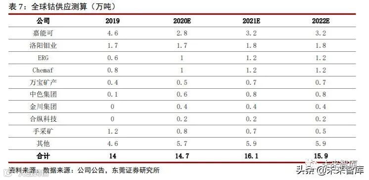 根据主要钴矿企业产量指引,预测 2020-2022 年全球钴产量分别为 14.7、16.1、15.9 万吨,同比增速分别为 5%、10%、-1%,增速较 2019 年显著放缓。