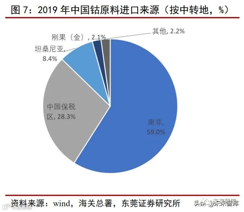 中国钴原料进口地、中转地高度集中。根据海关数据,2019 年,按照产销地统计, 我国从刚果(金)进口钴原料(包括钴矿和钴湿法冶炼中间品)为 6.41 万吨,占整体进 口量比例为 51.5%,从南非进口钴原料 3.44 万吨,占比为 27.6%。按中转地统计,2019 年我国钴原料进口经南非进行中转占比达到 59%,经坦桑尼亚中转运输的钴原料占比为 8.4%。