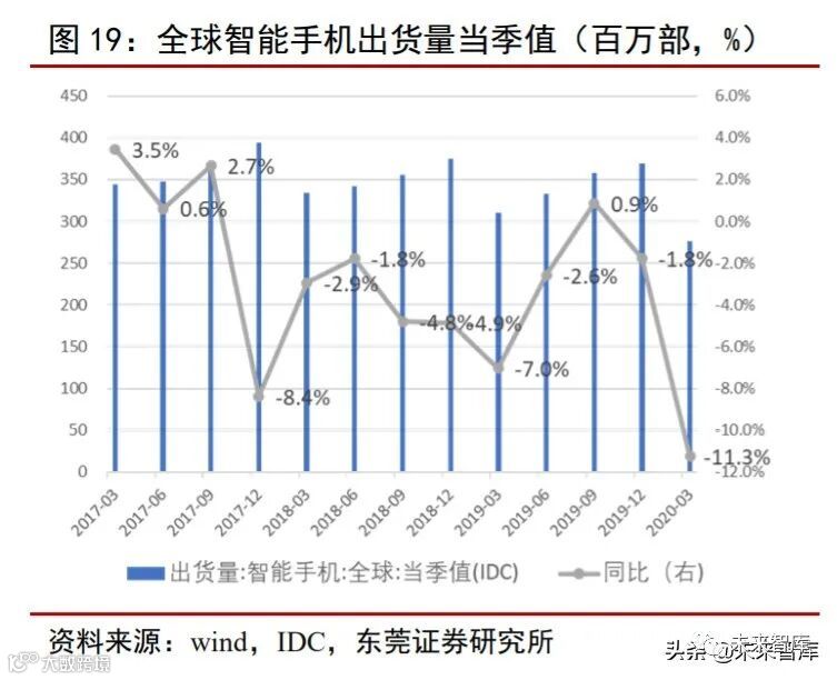 消费电子产品产销量边际回暖。根据 IDC 数据,2020Q1、2020Q2 全球 PC 出货量分 别同比-9%、+11%,2020H 上半年同比+1.7%,PC 呈边际回暖;受疫情影响,2020Q1 全 球智能手机出货量同比-11.3%,随着智能手机主要消费国(欧美、中日韩)复工复产推 进,预期下半年出货量迎来边际改善。