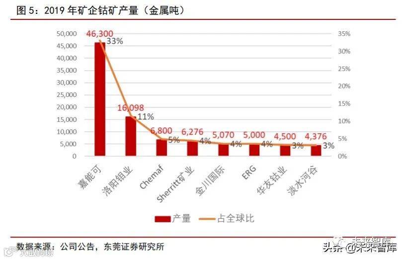 钴产量在企业端分布集中。从企业产量维度看,钴矿供应端寡头垄断格局,2019 年 CR3 占比达全球产量约 50%。嘉能可是全球最大的钴生产商和贸易商。2019 年,嘉能可 钴产量达到 4.63 万金属吨,占全球钴总产量比例 33%,且显著领先其他钴矿生产企业;第二名洛阳钼业产量为 1.6 万金属吨,占全球比例 11%。嘉能可不仅是全球第一大钴生 产商,同时也是全球最大的钴贸易商,在钴行业中长期占据主导地位。