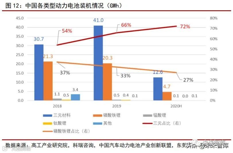 中国三元动力电池主流地位不断强化。2018-2020H,中国三元电池装机占整体装机量比例持续上升,分别为 54%、66%、72%;磷酸铁锂电池装机量占比持续下降,分别为 37%、33%、27%。三元电池装机量保持稳定增长态势,装机量占比逐渐超过磷酸铁锂且 领先优势逐渐扩大。