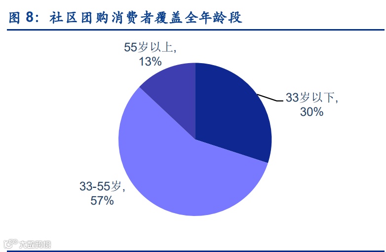 在用户结构年龄上,社区团购 70%的用户为 33 岁以上群体,13%的用户为 55 岁以上群体, 实现了全年龄段的覆盖,参考以外卖为代表的传统 O2O 业务,面向的群体主要是年轻人, 社区团购具备差异化的获客能力,同时经营数据表明这群客户对社区团购平台有一定粘性。