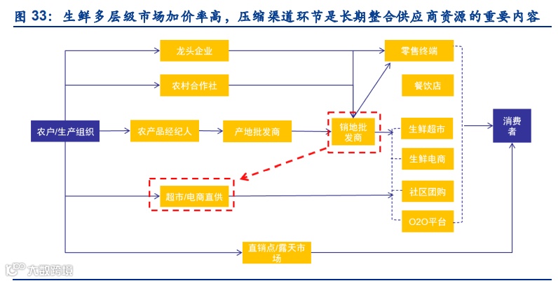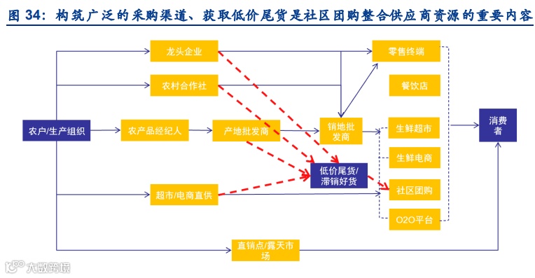 建立供应链优势的核心在于能够获得稳定、低价的商品供给以及高效、低成本的流通环节。流通环节层级繁多,使得流通过程损耗大,溢价多,利润挖掘空间大,我们认为社区团购掌 握商品竞争力、压缩流通环节成本主要有两种切入方式:1)生产端直营:自建生产基地, 或者与农户建立长期稳定的合作,从开端把控产品品质,最大化压缩流通成本,构建三级供 应链短链条。但直营模式更适用于土豆、鸡蛋等需求和生产均较为稳定的品种,否则消费者 端需求的变化易发生滞销,自然灾害的发生也会造成亏损;2)整合经销商资源:广泛合作 经销商可以转移生产环节亏损风险,同时发挥规模化采购优势,压缩采购成本的同时选品种 类也更为丰富。①高品质产品:与更接近生产端的大型经销商建立长期合作,平台可以获得 稳定的优质产品供给;②低价尾货:社区团购覆盖的消费者中包含一部分价格敏感性消费者, 他们对产品品质要求较低,对价格更为敏感。社区团购企业若能深入生鲜产业链,与大量中 游经销商合作,有望利用这部分消费者消化经销商尾货库存。