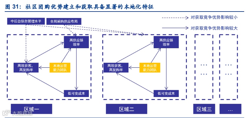 业务优势在区域之间无明显协同。尽管信息化供应水平和全国供应链布局带来的采购优势也 将带来客户运营、供应链上的优势,但由于国内特殊的生鲜生产格局,全局采购带来的成本 优势并不明显,而以数据驱动精益管理上,主要的互联网公司能力差距并不明显,这意味着 或难有参与者拥有能左右全局的竞争优势,业务优势的建立更取决于能否在区域内跑通‚高 供应链效率-低可变成本低价-高效获客高复购率‛的循环。重资产、标准化程度低及区域差 异化的特点,或决定了业务竞争会以区域为单位摸索前行。