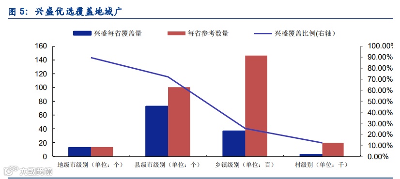 社区团购发轫于下沉市场、适应了从二线城市到农村的广阔市场,这是外卖等目前主流的 O2O 业务模式难以比拟的。以兴盛优选为例,至 2020 年 9 月,兴盛优选已覆盖 13 个省、 161 个地级市、938 个县市级 4777 个乡镇和 31405 个村,参照每个省 14 个地级市、100 个县、1460 个乡镇和 24000 个村估算,兴盛优选在县市一级已实现较好的覆盖;而根据公 司披露,湖南当地基本已实现村一级的覆盖,乡村用户客单价略低于城市客户,但有更高的 购买频次(10-11 次对比城市用户的 10 次)和更好的毛利结构,其他多个平台的运营也证明 证明社区团购有下沉到农村的能力。相比之下,外卖行业在三线以下城市地区渗透率仅 30%-40%,且用户活跃度远远低于一二线城市,70%以上订单由一二线城市贡献,农村地区 更是几乎没有外卖。
