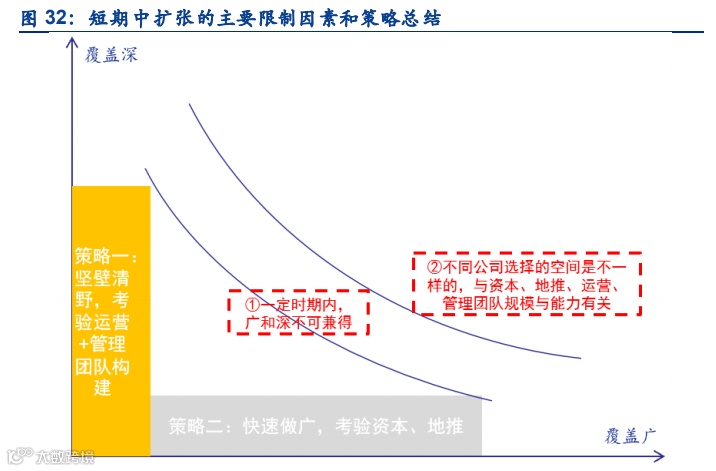 在短期,社区团购拓展依赖资本+地推快速跑马圈地,运营+管理坚壁清野。一定时期内,覆 盖广和深不可兼得,因为团队规模和新团队构建速度总是有限的,扩张策略即包括做深和做广,做广对资本、地推规模和能力的要求更高,精细运营跟不上易造成亏损,但抓住空白市 场会有先发优势;做深更依赖运营、管理,更容易在当地立足,但有错过市场拓展机会的风 险。地推和资本是这阶段两种重要的能力/资源,总部的管理机制和协调能力是隐性的扩张制 约因素。