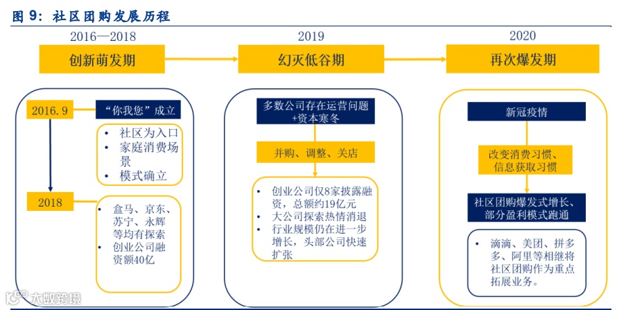从当下主流的社区团购的模式的发展经历来看,社区团购大体可以分为三个阶段:① 2016-2018,模式确立,千团竞逐,赛道火热:2016 年的 9 月,‚你我您‛成立并以社区为 入口瞄准家庭消费场景,开创了目前社区团购主要的经营模式。尽管‚你我您‛并非创立最 早的社区团购公司,但这一模式相较于早期的手抄单发布团购消息等方式优势明显,模式确 立之后,行业快速爆发,盒马、京东、苏宁、永辉等均有探索,创业公司井喷,2018 年,融 资额高达 40 亿。②2019 年,风口之后,经营问题显现叠加资本寒冬,并购、调整、关店成 了社区团购行业的主题,头部公司仍在快速扩张。2019 年,创业公司中仅 8 家披露了融资, 融资总额约 19 亿元,同时大公司探索热情消退,但行业规模仍在进一步增长。③2020 年, 新冠疫情深刻改变了消费习惯和信息获取习惯,社区团购迎来爆发式增长,并实现盈利模式 的跑通,滴滴、美团、拼多多、阿里等相继将社区团购作为重点拓展业务,社区团购开始在 全国范围内拓展。
